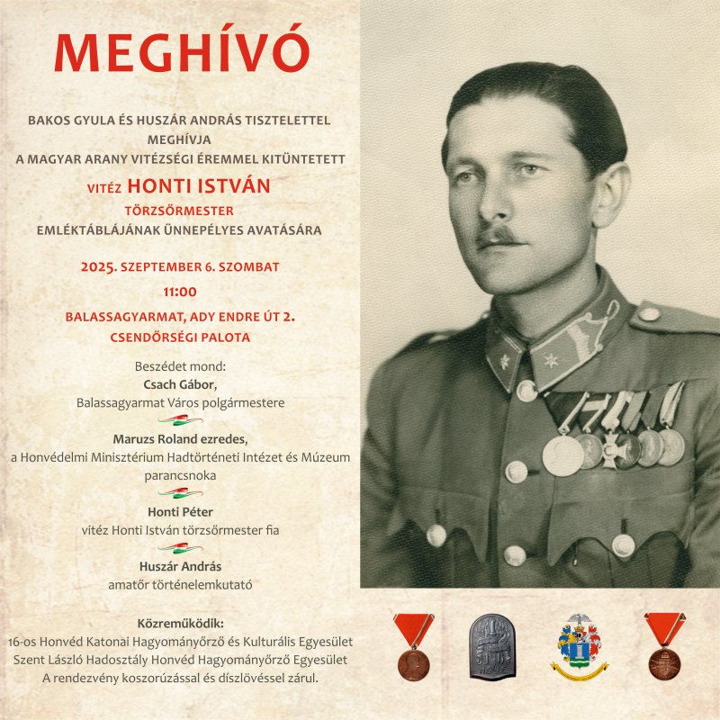Nagylelkű, önzetlen, a magyar katonahősöket tisztelő emberek összefogásának hála, összegyűlt a szükséges forrás a Magyar Arany Vitézségi Éremmel kitüntetett vitéz Honti István törzsőrmester emléktáblájára, amelyet ünnepélyes körülmények között avatunk majd fel a legbátrabb városban, 2025. szeptember 6-án (szombat), 11 órai kezdettel.
