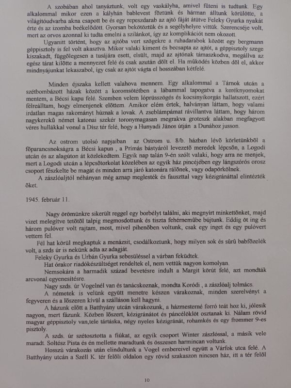 „…a Gellérthegy utca felé, egy repülőgép észrevett és alacsonyan repülve géppuska tüzet nyitott ránk. A Gellérthegy utca jobb oldali első háza mellett kerestünk fedezéket. A géppuskázás után a gép megfordult és magasabban repülve bombát oldott ki felettünk, amelyik a bal oldali házat érte és a robbanás törmelékkel, meg tégladarabokkal borított be mindhármunkat. Szerencsésen megúsztuk…”