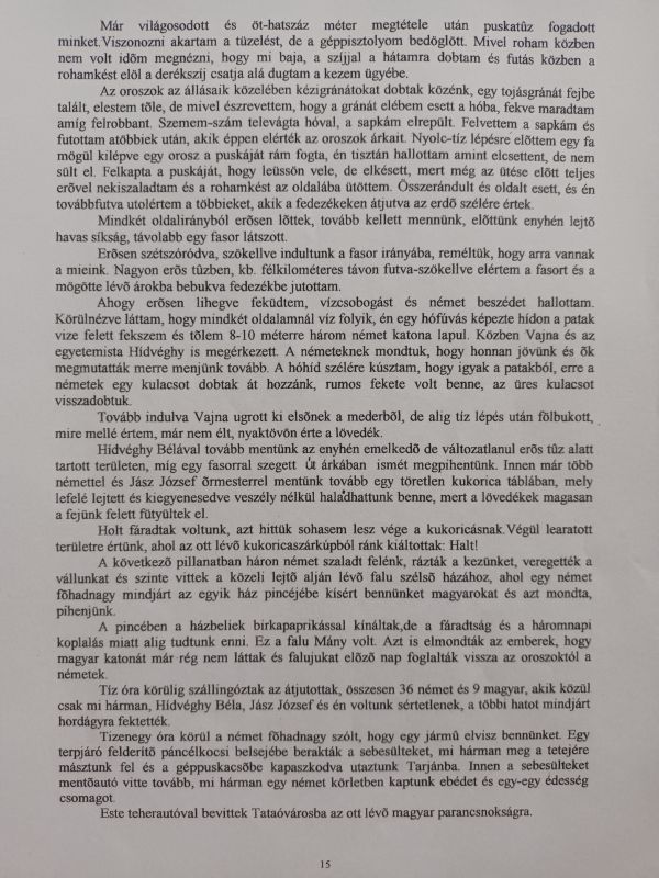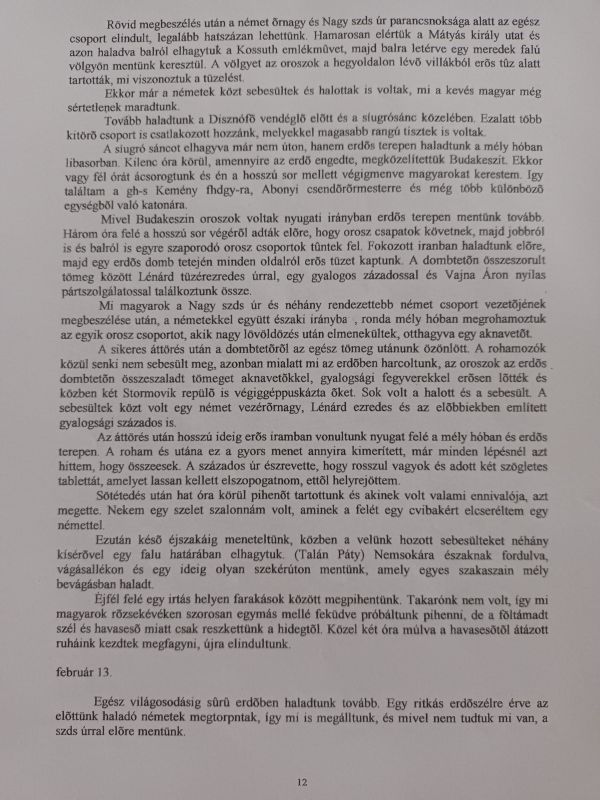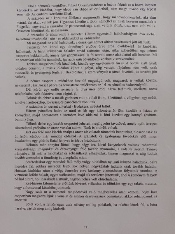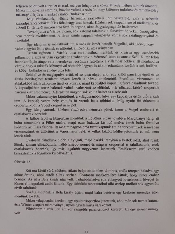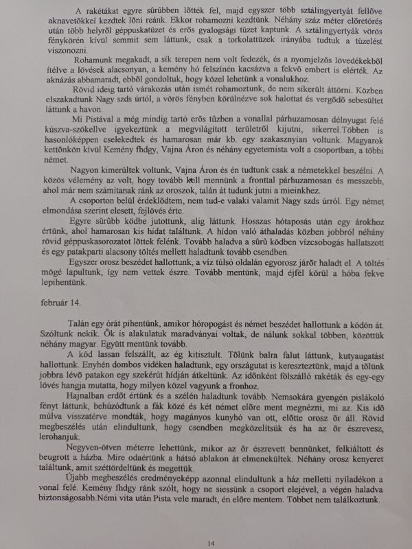 „Alighogy tovább indultunk, már fütyültek is felettünk az aknák. Gyorsan a közeli kapualjba ugrottam és valami farakás mögé lapultam. Mialatt az aknák robbantak, azt éreztem, mintha hajfürt érné az arcomat. Mikor csend lett, óvatosan felvillantottam a lámpámat, akkor láttam, hogy fagyott hullákból való rakás mögött kerestem fedezéket.”