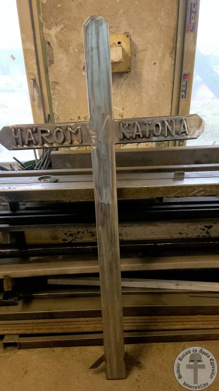 Polgár Zsolt, lakatosműhelyben dolgozó egyesületi tagunk azonnal tervezni kezdett és munkához is látott. Elkészítette az 5 mm vastag falú, másfél méteres fémkeresztet. A kereszt vízszintes száraira fémből hegesztette fel a betűket ugyanúgy, mint ahogy az a fakereszten volt olvasható.