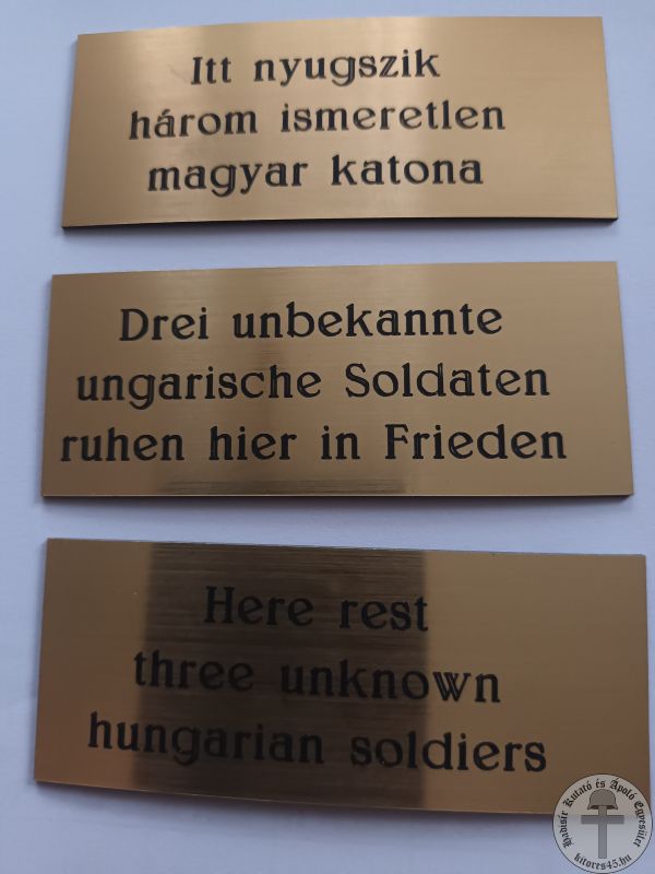Közben elkészíttettük a keresztre a három nyelvű táblácskákat is, mint ahogy a fakereszten volt eddig olvasható: magyarul, németül és angolul.